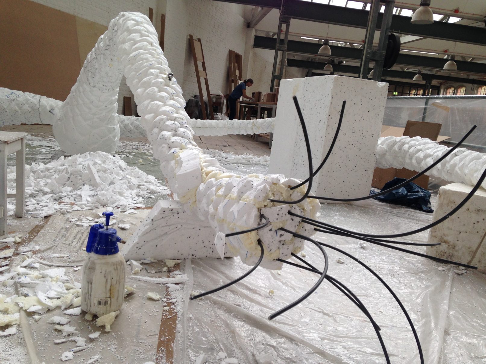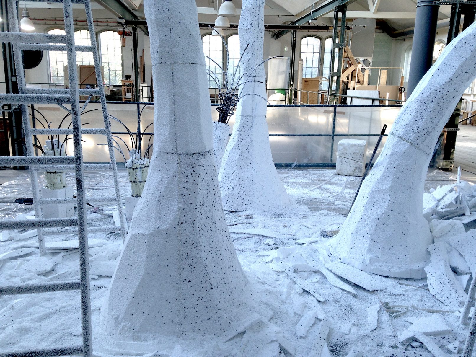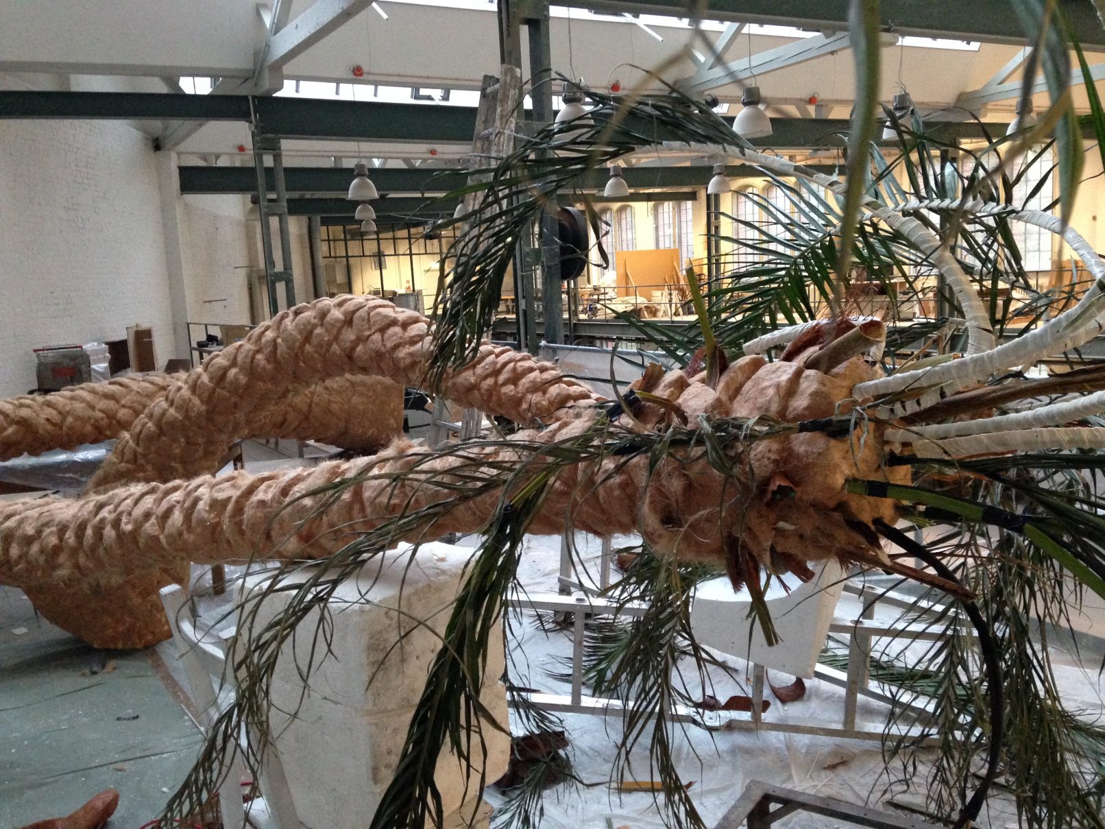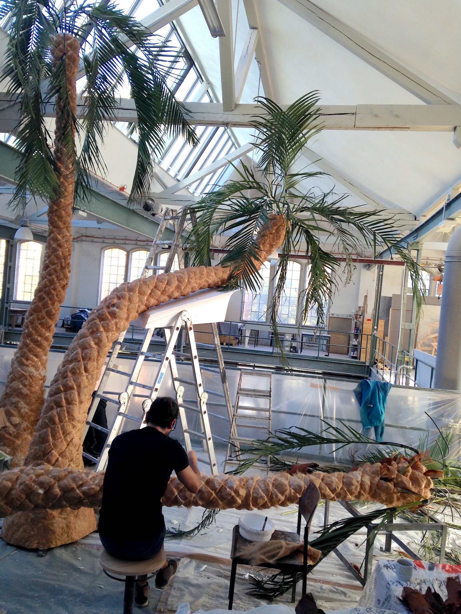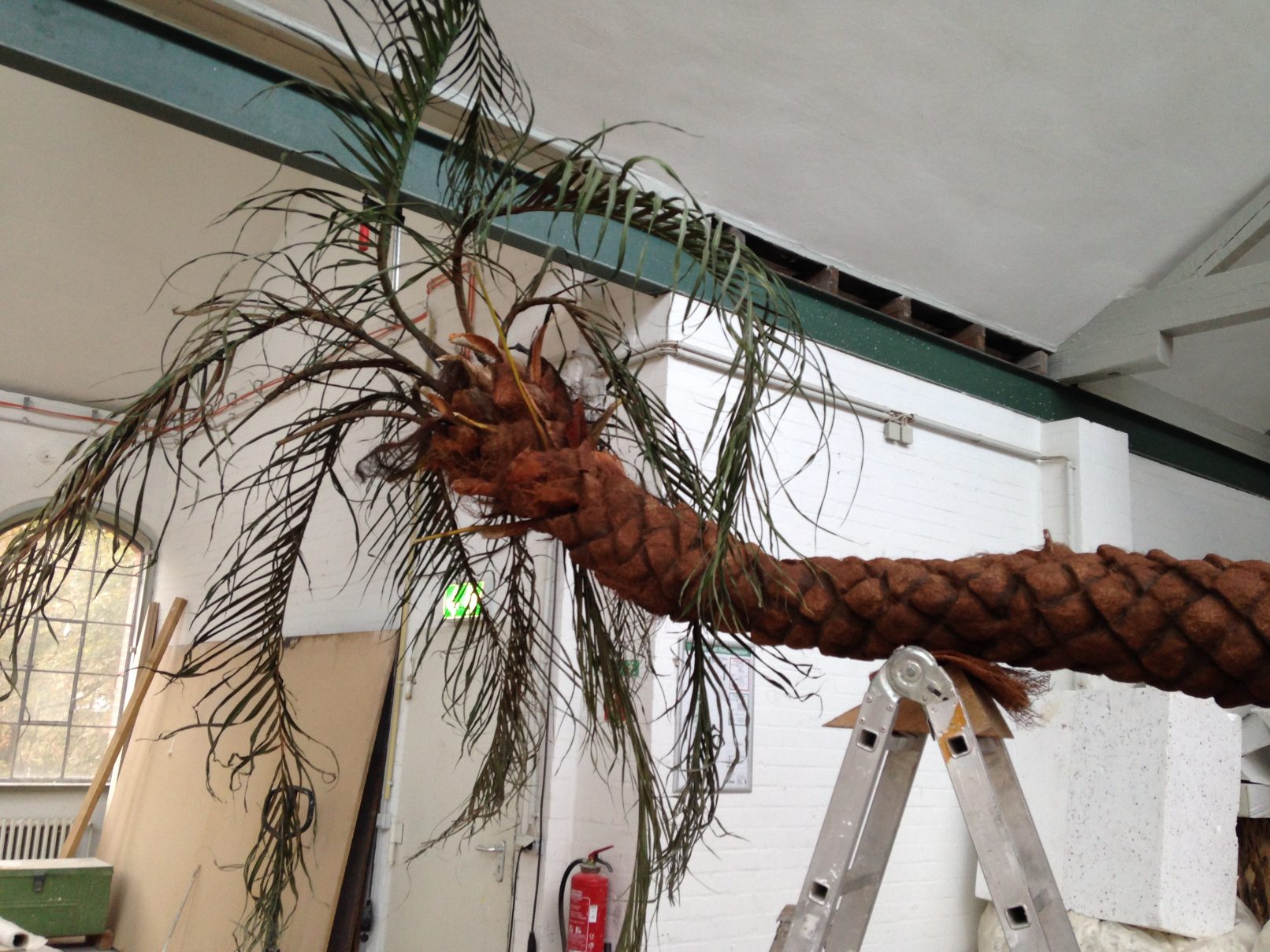 Beschreibung: Es waren schon Palmen vorhanden für diese Übernahme vom Schauspiel Stuttgart. Da die Bühne der Volksbühne aber größer ist, fertigte ich noch 3 weitere Palmen in ähnlicher Formgebung.